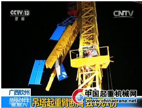 广西钦州一正建工地发生吊塔起重臂断裂事故 致1死1伤
